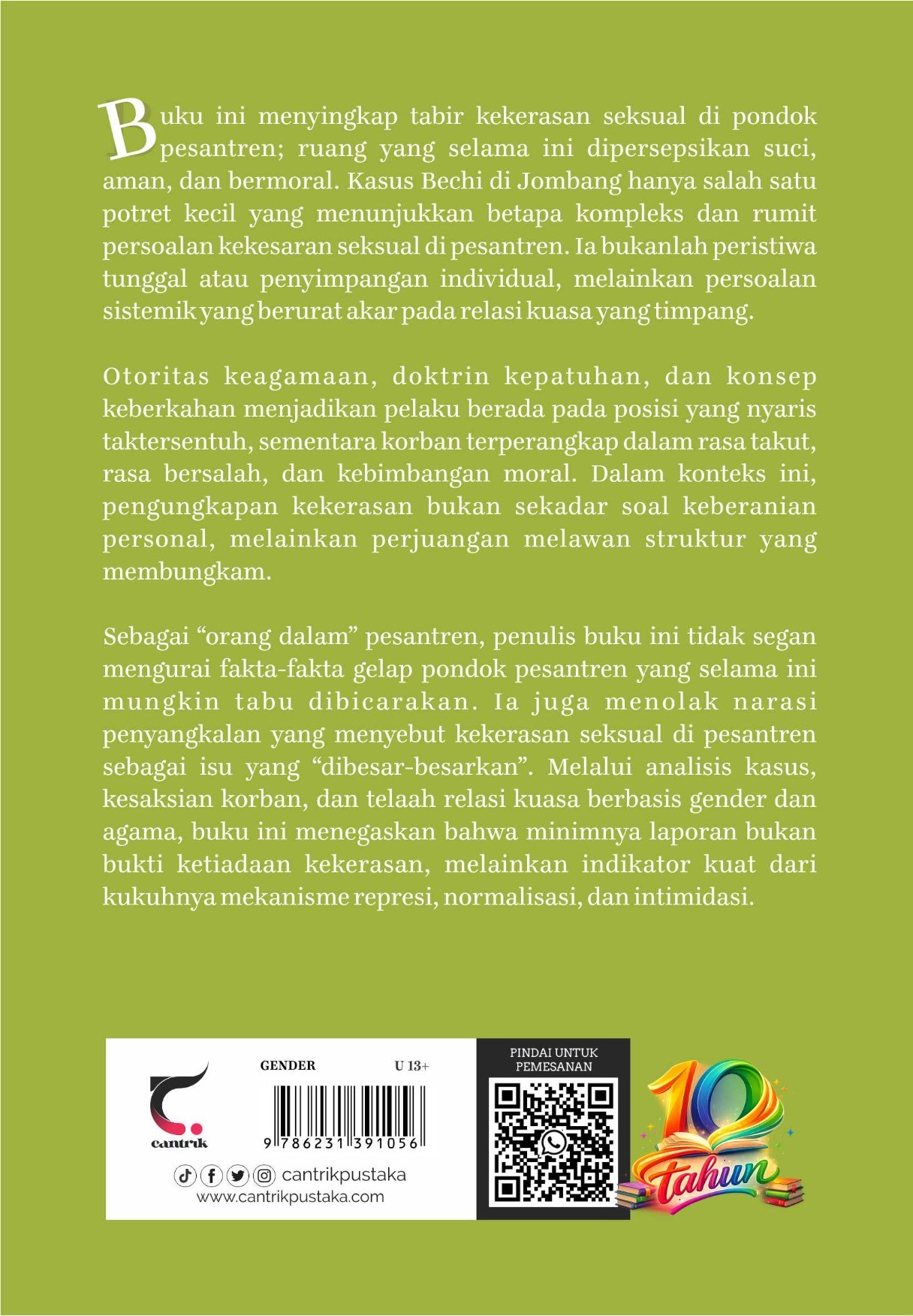 Buku ini menyingkap tabir kekerasan seksual di pondok pesantren; ruang yang selama ini dipersepsikan suci, aman, dan bermoral. Kasus Bechi di Jombang hanya salah satu potret kecil yang menunjukkan betapa kompleks dan rumit persoalan kekesaran seksual di pesantren. Ia bukanlah peristiwa tunggal atau penyimpangan individual, melainkan persoalan sistemik yang berurat akar pada relasi kuasa yang timpang.