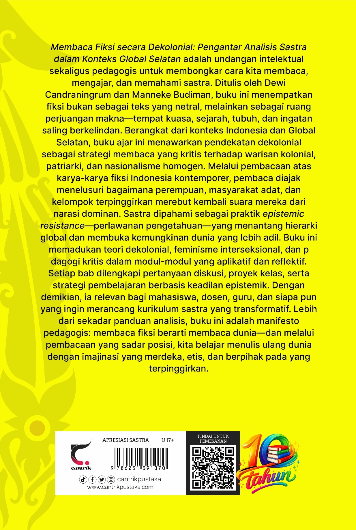 Membaca Fiksi secara Dekolonial: Pengantar Analisis Sastra dalam Konteks Global Selatan adalah undangan intelektual sekaligus pedagogis untuk membongkar cara kita membaca, mengajar, dan memahami sastra. Ditulis oleh Dewi Candraningrum dan Manneke Budiman, buku ini menempatkan fiksi bukan sebagai teks yang netral, melainkan sebagai ruang perjuangan makna—tempat kuasa, sejarah, tubuh, dan ingatan saling berkelindan. Berangkat dari konteks Indonesia dan Global Selatan, buku ajar ini menawarkan pendekatan dekolonial sebagai strategi membaca yang kritis terhadap warisan kolonial, patriarki, dan nasionalisme homogen. Melalui pembacaan atas karya-karya fiksi Indonesia kontemporer, pembaca diajak menelusuri bagaimana perempuan, masyarakat adat, dan kelompok terpinggirkan merebut kembali suara mereka dari narasi dominan. Sastra dipahami sebagai praktik epistemic resistance—perlawanan pengetahuan—yang menantang hierarki global dan membuka kemungkinan dunia yang lebih adil. Buku ini memadukan teori dekolonial, feminisme interseksional, dan pedagogi kritis dalam modul-modul yang aplikatif dan reflektif. Setiap bab dilengkapi pertanyaan diskusi, proyek kelas, serta strategi pembelajaran berbasis keadilan epistemik. Dengan demikian, ia relevan bagi mahasiswa, dosen, guru, dan siapa pun yang ingin merancang kurikulum sastra yang transformatif. Lebih dari sekadar panduan analisis, buku ini adalah manifesto pedagogis: membaca fiksi berarti membaca dunia—dan melalui pembacaan yang sadar posisi, kita belajar menulis ulang dunia dengan imajinasi yang merdeka, etis, dan berpihak pada yang terpinggirkan.