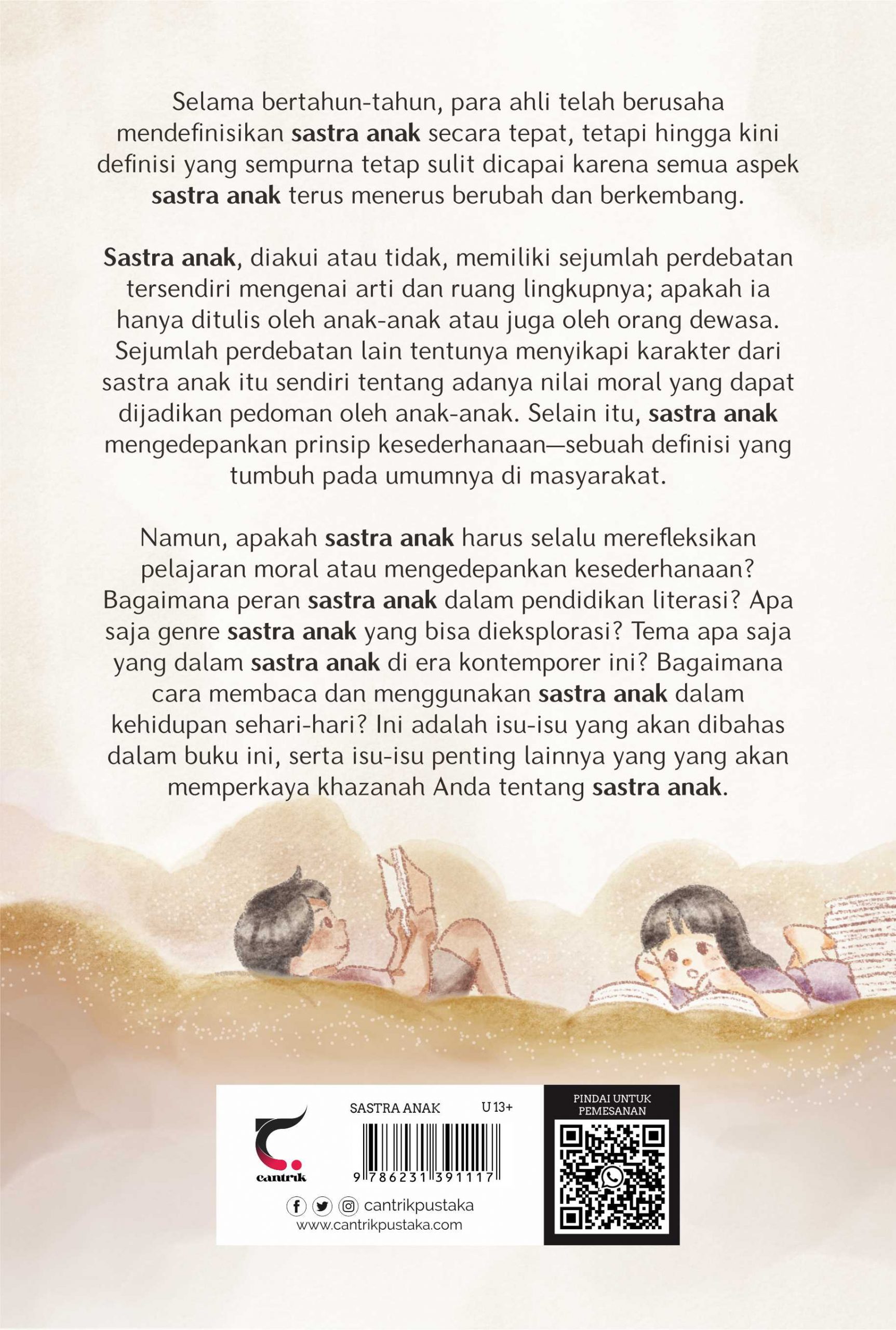 Namun, apakah sastra anak harus selalu merefleksikan pelajaran moral atau mengedepankan kesederhanaan? Bagaimana peran sastra anak dalam pendidikan literasi? Apa saja genre sastra anak yang bisa dieksplorasi? Tema apa saja yang dalam sastra anak di era kontemporer ini? Bagaimana cara membaca dan menggunakan sastra anak dalam kehidupan sehari-hari? Ini adalah isu-isu yang akan dibahas dalam buku ini, serta isu-isu penting lainnya yang yang akan memperkaya khazanah Anda tentang sastra anak.