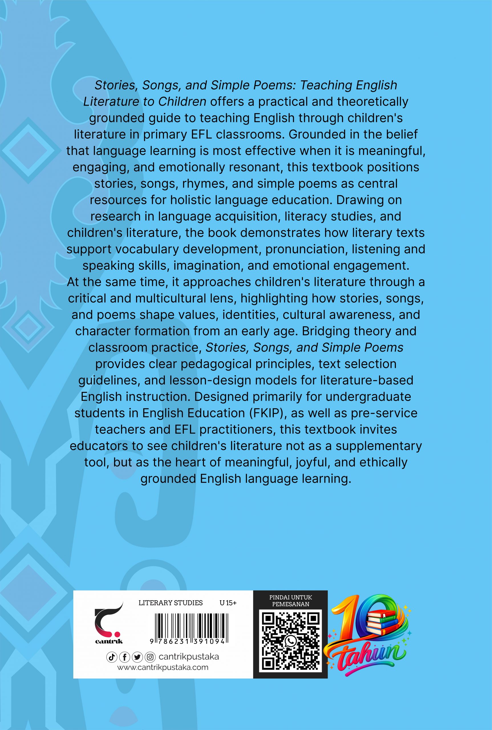 Stories, Songs, and Simple Poems: Teaching English Literature to Children offers a practical and theoretically grounded guide to teaching English through children’s literature in primary EFL classrooms. Grounded in the belief that language learning is most effective when it is meaningful, engaging, and emotionally resonant, this textbook positions stories, songs, rhymes, and simple poems as central resources for holistic language education. Drawing on research in language acquisition, literacy studies, and children’s literature, the book demonstrates how literary texts support vocabulary development, pronunciation, listening and speaking skills, imagination, and emotional engagement. At the same time, it approaches children’s literature through a critical and multicultural lens, highlighting how stories, songs, and poems shape values, identities, cultural awareness, and character formation from an early age. Bridging theory and classroom practice, Stories, Songs, and Simple Poems provides clear pedagogical principles, text selection guidelines, and lesson-design models for literature-based English instruction. Designed primarily for undergraduate students in English Education (FKIP), as well as pre-service teachers and EFL practitioners, this textbook invites educators to see children’s literature not as a supplementary tool, but as the heart of meaningful, joyful, and ethically grounded English language learning.