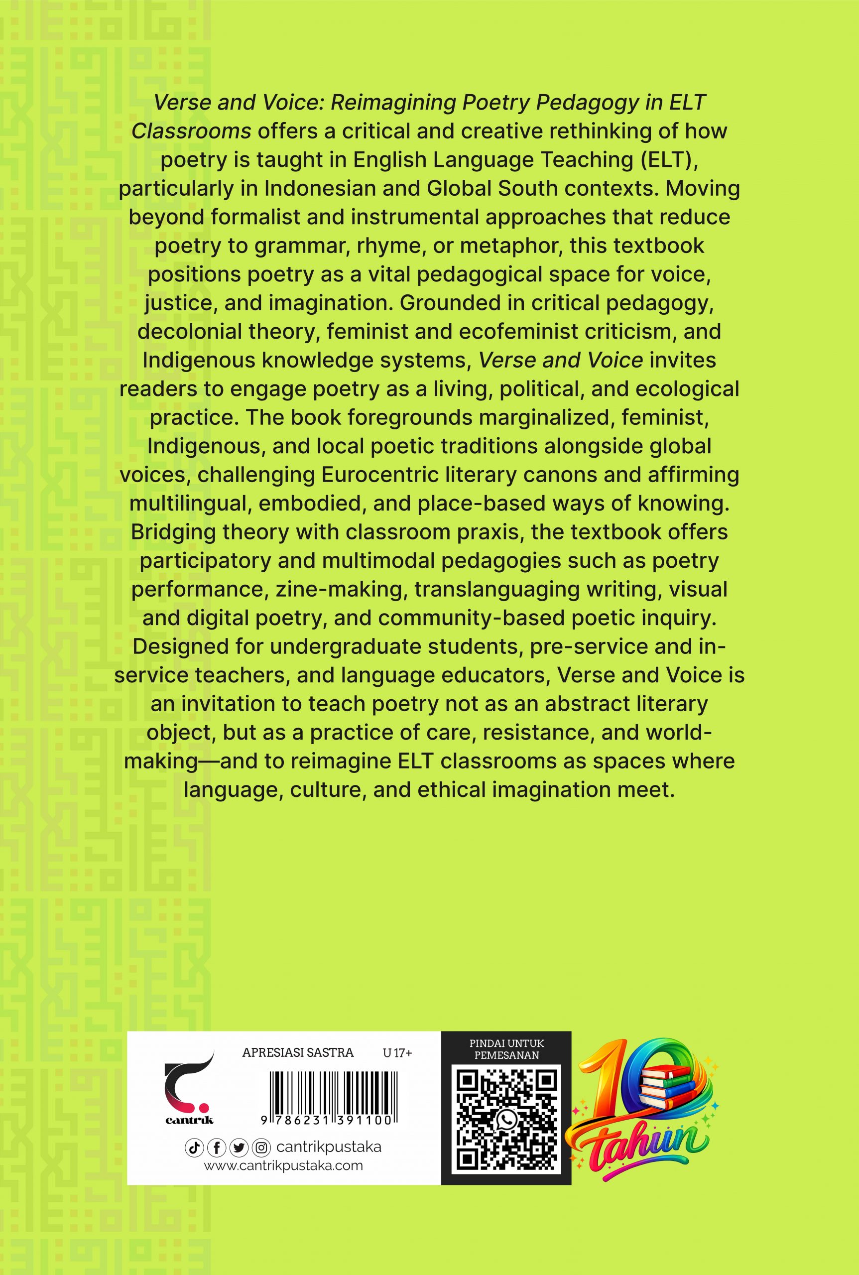 Verse and Voice: Reimagining Poetry Pedagogy in ELT Classrooms offers a critical and creative rethinking of how poetry is taught in English Language Teaching (ELT), particularly in Indonesian and Global South contexts. Moving beyond formalist and instrumental approaches that reduce poetry to grammar, rhyme, or metaphor, this textbook positions poetry as a vital pedagogical space for voice, justice, and imagination. Grounded in critical pedagogy, decolonial theory, feminist and ecofeminist criticism, and Indigenous knowledge systems, Verse and Voice invites readers to engage poetry as a living, political, and ecological practice. The book foregrounds marginalized, feminist, Indigenous, and local poetic traditions alongside global voices, challenging Eurocentric literary canons and affirming multilingual, embodied, and place-based ways of knowing. Bridging theory with classroom praxis, the textbook offers participatory and multimodal pedagogies such as poetry performance, zine-making, translanguaging writing, visual and digital poetry, and community-based poetic inquiry. Designed for undergraduate students, pre-service and in-service teachers, and language educators, Verse and Voice is an invitation to teach poetry not as an abstract literary object, but as a practice of care, resistance, and world-making—and to reimagine ELT classrooms as spaces where language, culture, and ethical imagination meet.